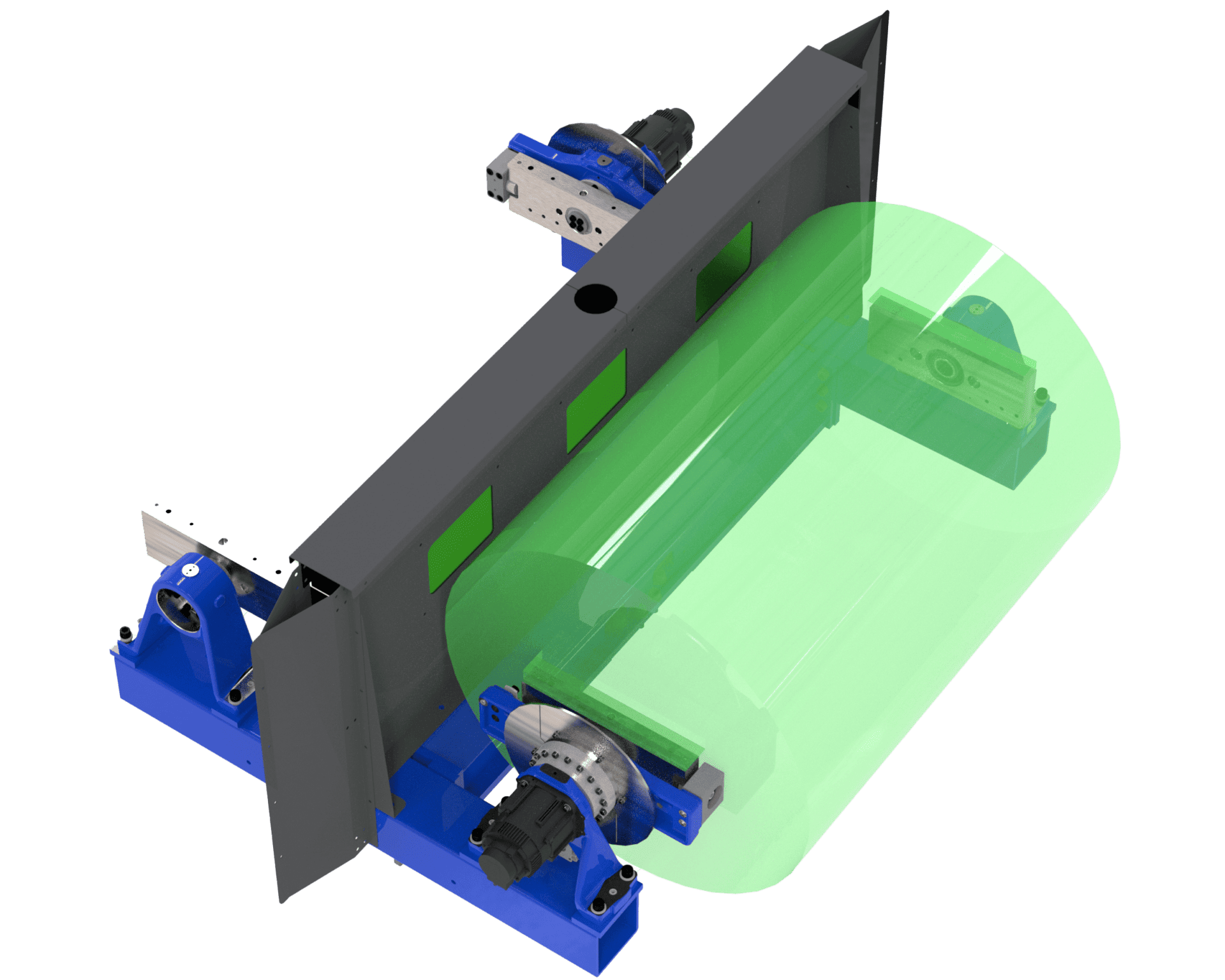 An operator is necessary for the daily loading and unloading of components. The workpieces can be loaded using an overhead crane while the robot performs welding.